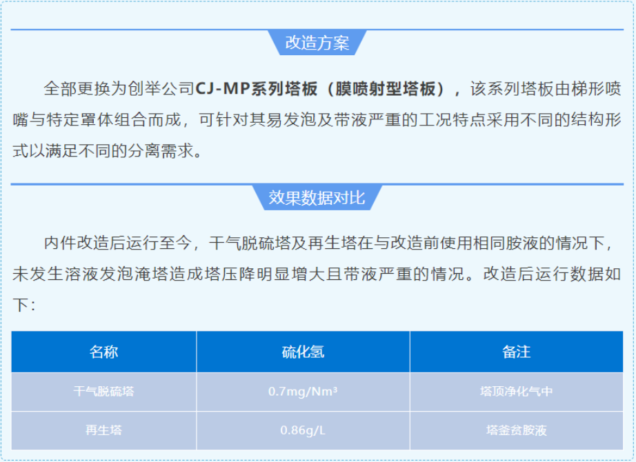 全部工程改造完工后,各項技術(shù)指標(biāo)均滿足生產(chǎn)要求,達(dá)到了改造的目的和預(yù)期,緩解業(yè)主單位的環(huán)保壓力的同時延長了設(shè)備檢修周期。創(chuàng)舉公司新型CJ系列高效噴射態(tài)塔盤技術(shù)在脫硫化氫塔、干氣脫硫塔及再生塔的應(yīng)用效果,得到了榆林煉化領(lǐng)導(dǎo)的高度認(rèn)可。該項目的順利開車是創(chuàng)舉公司在行業(yè)內(nèi)的又一次成功改造案例。
