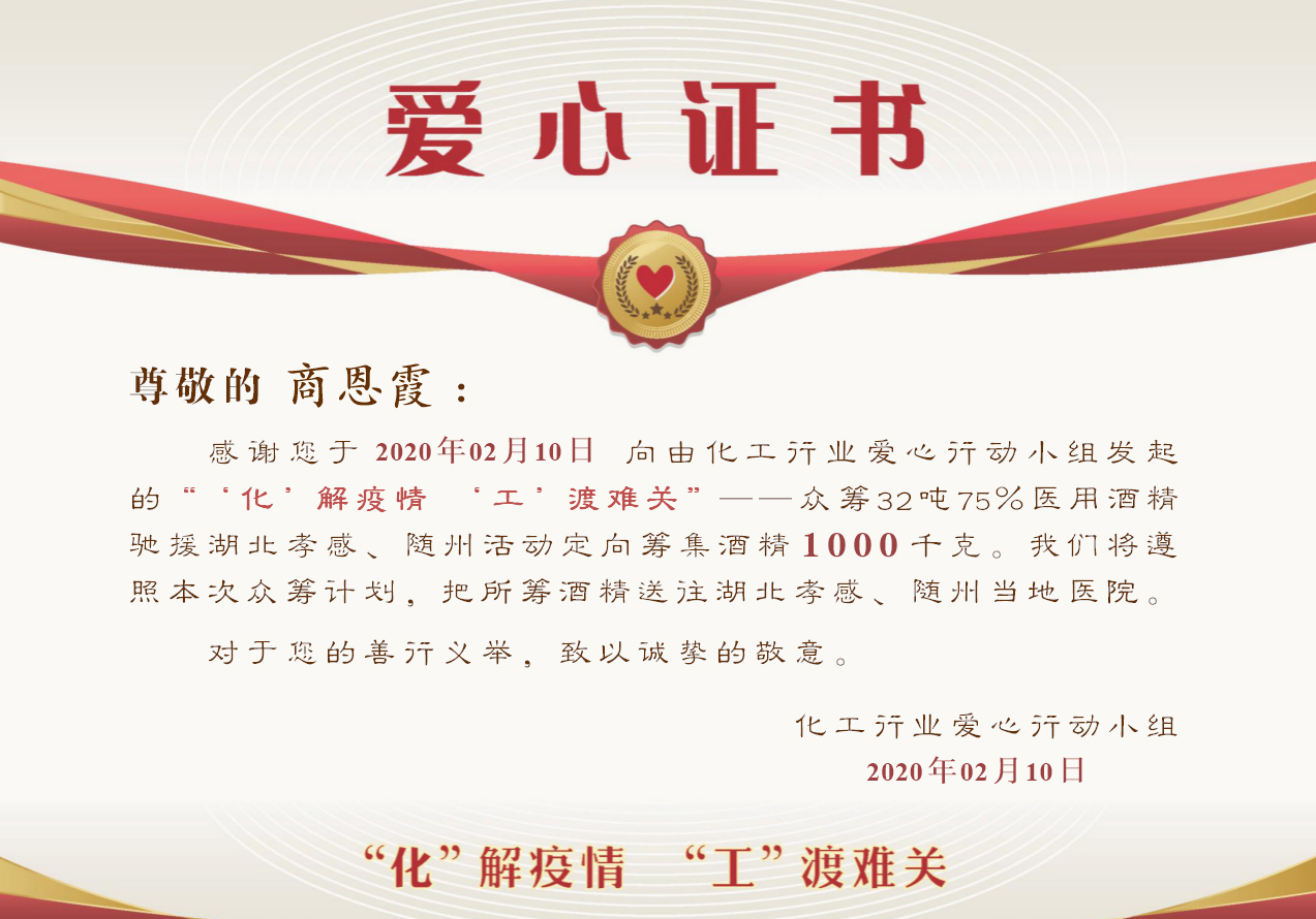 “風(fēng)雨同舟抗疫情,心手相牽向春天。在我市新冠疫情防控的關(guān)鍵時(shí)刻,貴同盟心懷大愛(ài),解囊相助,雪中送炭,捐贈(zèng)醫(yī)用酒精25桶,為我們戰(zhàn)勝疫情增添了信心和力量。安陸市委、市政府和全市63萬(wàn)人民謹(jǐn)向貴同盟致以崇高的敬意和衷心感謝!”2020年3月,湖北省安陸市委、市政府向石油化工愛(ài)心同盟發(fā)來(lái)感謝信,對(duì)同盟在抗擊疫情過(guò)程中,對(duì)安陸市的酒精捐助表示敬意和感謝。