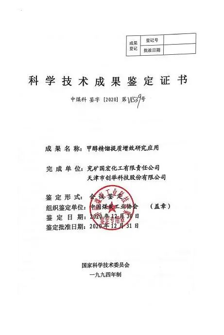 2019年9月15日,由天津市創(chuàng)舉科技股份有限公司(以下簡(jiǎn)稱“創(chuàng)舉科技”)承攬的兗礦集團(tuán)國(guó)宏化工有限責(zé)任公司(以下簡(jiǎn)稱“國(guó)宏公司”)65萬(wàn)噸/年甲醇精餾裝置改造項(xiàng)目一次投料開車成功。至今,裝置已滿負(fù)荷運(yùn)行18個(gè)月,達(dá)到日產(chǎn)精甲醇2050噸以上,精甲醇中的乙醇含量100 ppm以內(nèi),噸甲醇蒸汽耗量?jī)H0.85噸,節(jié)能降耗及提質(zhì)增效明顯。   2020年底,中國(guó)煤炭工業(yè)協(xié)會(huì)組織有關(guān)專家,對(duì)國(guó)宏公司及創(chuàng)舉科技共同申報(bào)的“甲醇精餾提質(zhì)增效研究應(yīng)用”技術(shù)進(jìn)行科學(xué)技術(shù)成果鑒定。經(jīng)專家鑒定,該項(xiàng)技術(shù)成果達(dá)到“ 國(guó)際先進(jìn) ”水平。