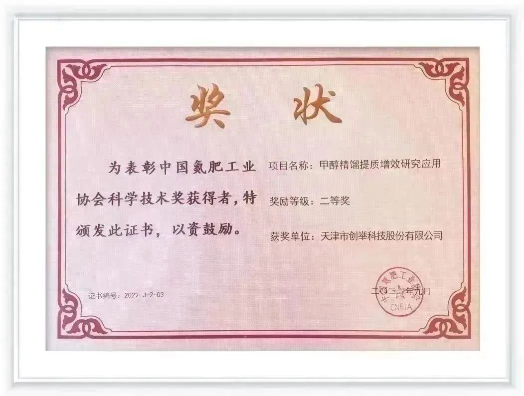 會(huì)上,中國(guó)氮肥工業(yè)協(xié)會(huì)對(duì)科技創(chuàng)新方面做出突出貢獻(xiàn)的企業(yè)進(jìn)行了表彰。天津市創(chuàng)舉科技股份有限公司(以下簡(jiǎn)稱“創(chuàng)舉科技”)申報(bào)的“甲醇精餾提質(zhì)增效研究應(yīng)用”項(xiàng)目,榮獲中國(guó)氮肥工業(yè)協(xié)會(huì)科學(xué)技術(shù)獎(jiǎng)二等獎(jiǎng)。