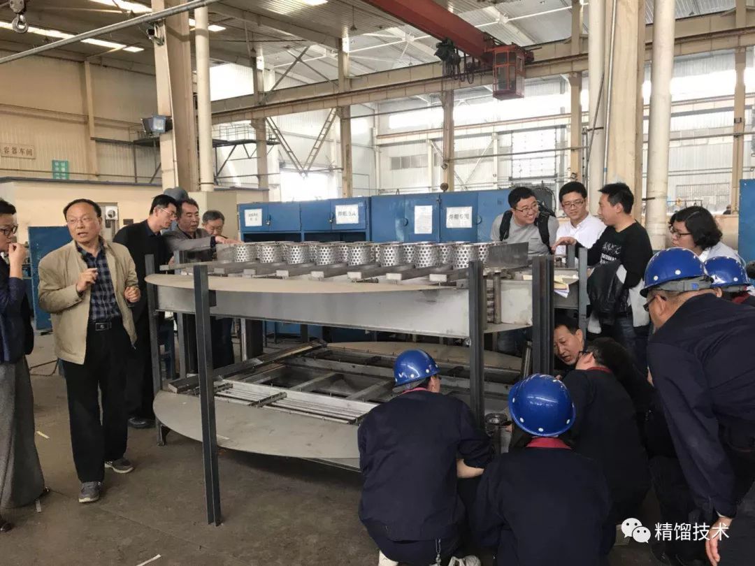 由于在實(shí)際生產(chǎn)中發(fā)現(xiàn)原塔盤(pán)壓降較高,故創(chuàng)舉公司本著對(duì)客戶負(fù)責(zé)的態(tài)度集思廣益,重新對(duì)原復(fù)合移熱塔盤(pán)進(jìn)行改進(jìn),在實(shí)現(xiàn)高效傳質(zhì)和傳熱同時(shí)進(jìn)行的前提下,降低塔盤(pán)壓降。新塔盤(pán)設(shè)計(jì)完成后,為了提早發(fā)現(xiàn)在塔盤(pán)安裝過(guò)程中可能存在的問(wèn)題,設(shè)備廠預(yù)制兩層等比例的新塔盤(pán),邀請(qǐng)浙江瀚普一行領(lǐng)導(dǎo)來(lái)創(chuàng)舉設(shè)備廠進(jìn)行考察,公司董事長(zhǎng)王柱祥和常務(wù)副總商恩霞帶領(lǐng)工藝部、設(shè)備部、工程部相關(guān)技術(shù)人員同時(shí)陪同,及時(shí)發(fā)現(xiàn)新塔盤(pán)結(jié)構(gòu)中的缺點(diǎn)并進(jìn)行優(yōu)化。充分體現(xiàn)了敬業(yè)、進(jìn)取、創(chuàng)新的創(chuàng)舉精神。